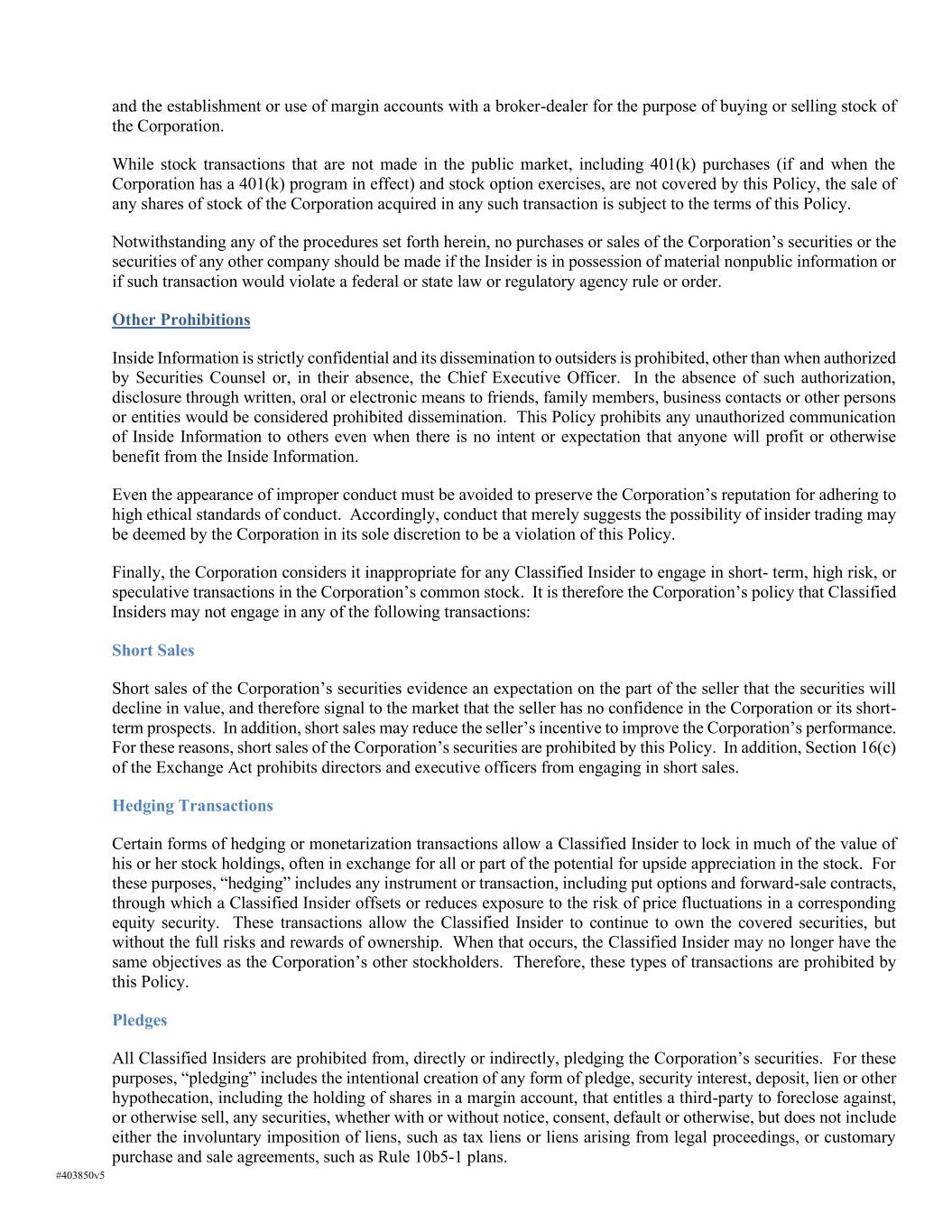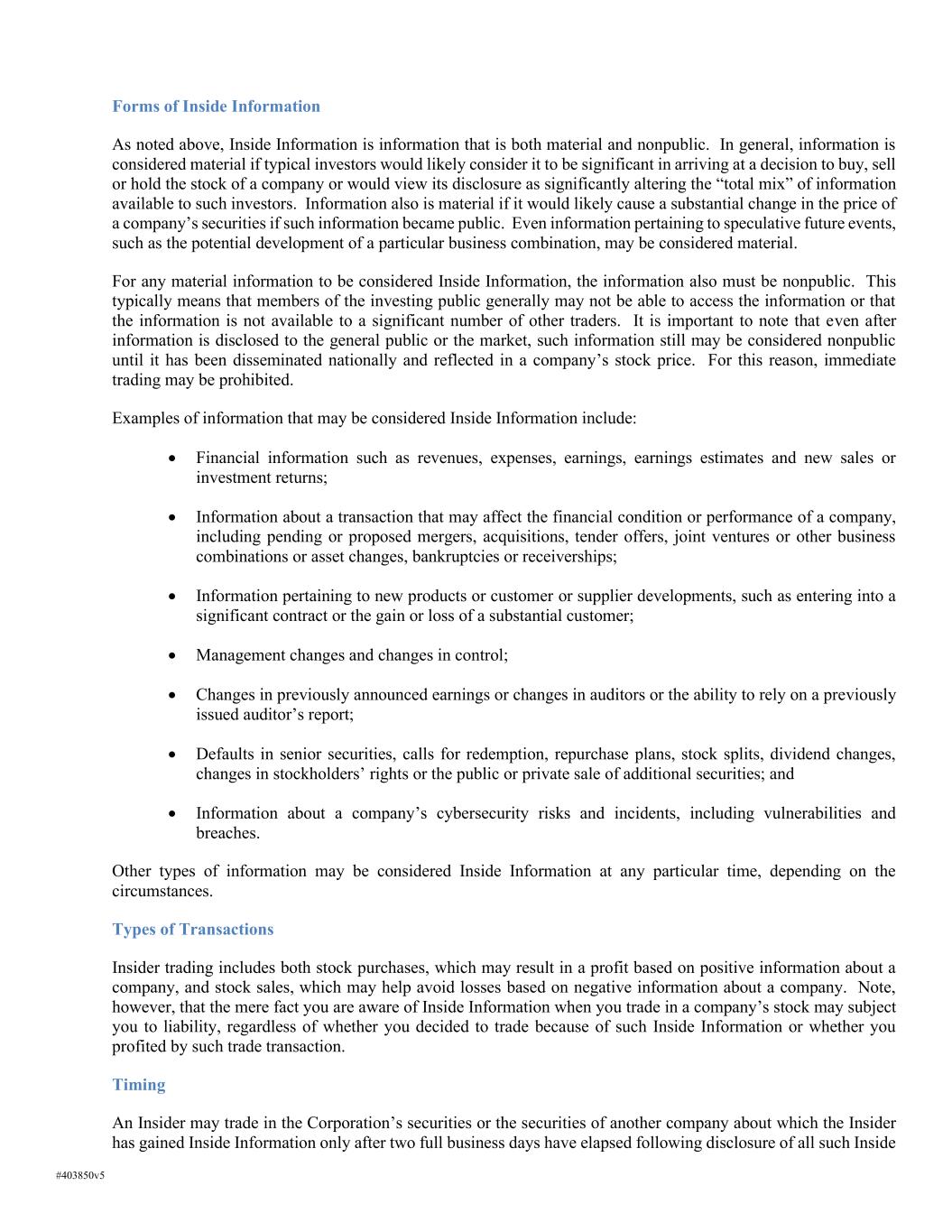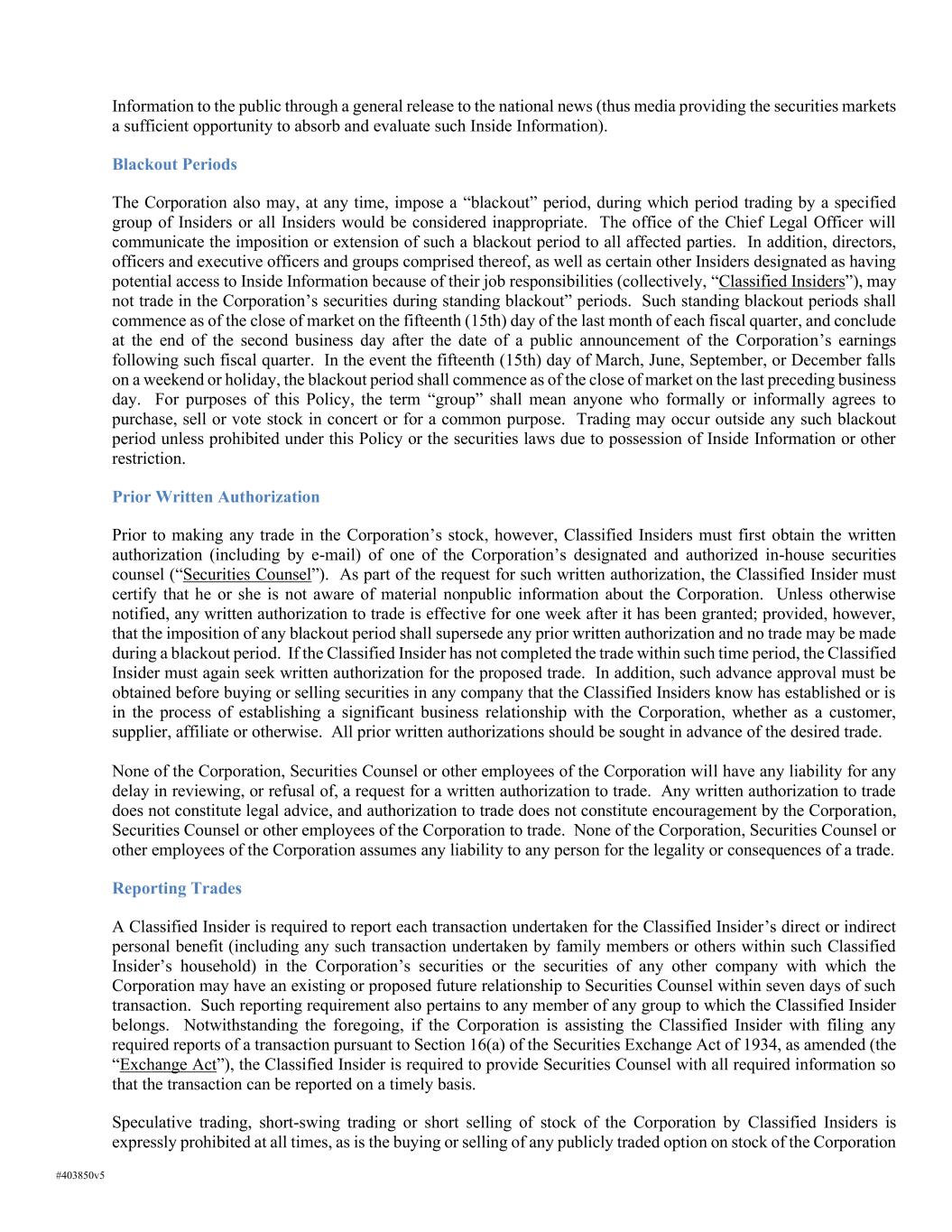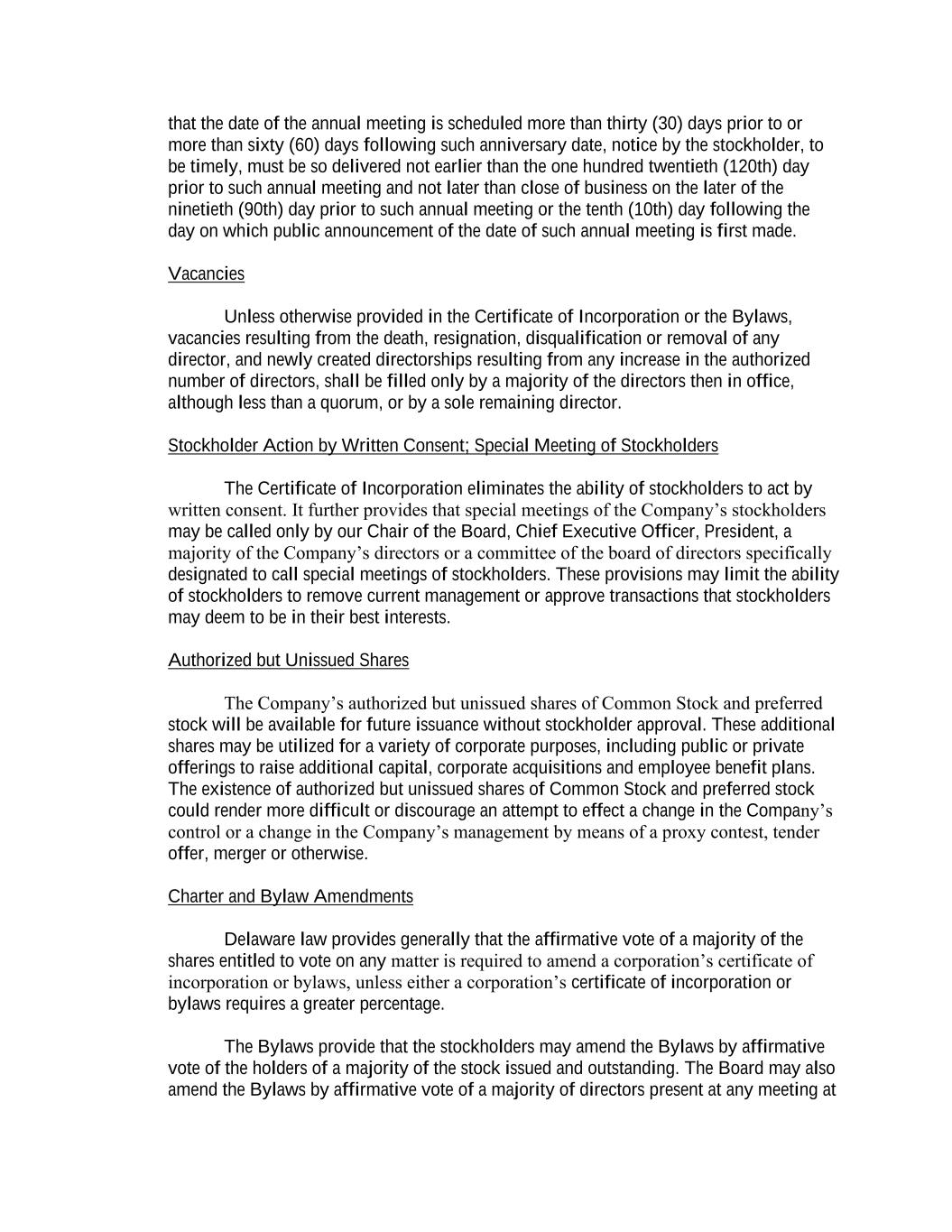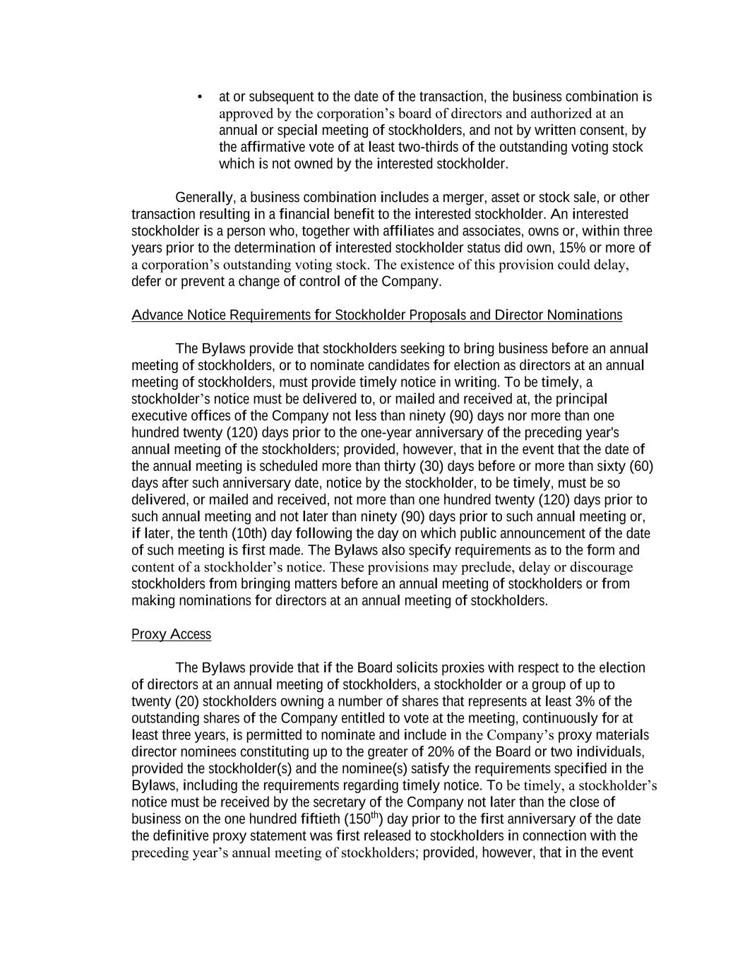 The agreements included or incorporated by reference as exhibits to this Form 10-K may contain representations and warranties by each of the parties to the applicable agreement. These representations and warranties were made solely for the benefit of the other parties to the applicable agreement and (i) were not intended to be treated as categorical statements of fact, but rather as a way of allocating the risk to one of the parties if those statements prove to be inaccurate; (ii) may have been qualified in such agreement by disclosures that were made to the other party in connection with the negotiation of the applicable agreement; (iii) may apply contract standards of “materiality” that are different from “materiality” under the applicable securities laws; and (iv) were made only as of the date of the applicable agreement or such other date or dates as may be specified in the agreement. The Company acknowledges that, notwithstanding the inclusion of the foregoing cautionary statements, it is responsible for considering whether additional specific disclosures of material information regarding material contractual provisions are required to make the statements in this Form 10-K not misleading.