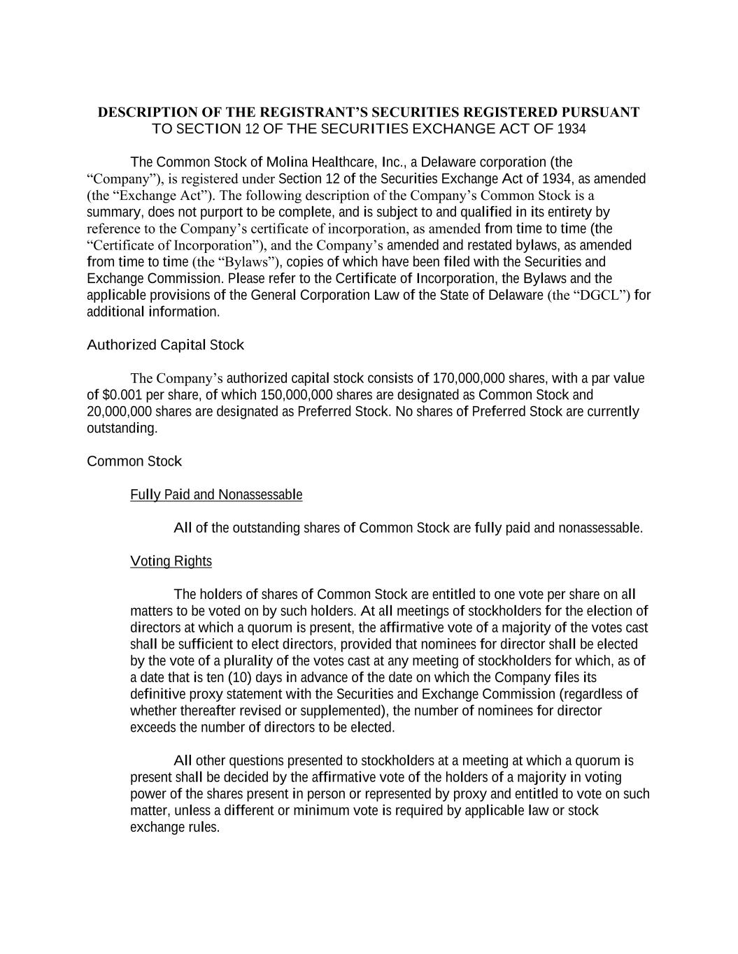 | Common Stock, $0.001 Par Value | MOH | New York Stock Exchange |